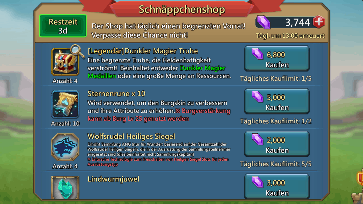 Im Schnäppchenshop kann man täglich folgende Gegenstände für Edelsteine erwerben: